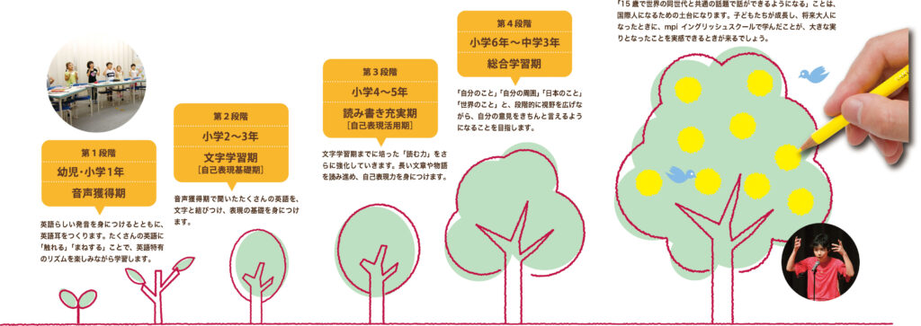 当教室は、mpiオリジナルの教材を使い、「聞く」「話す」「読む」「書く」の4技能を通じて、英語力を養うカリキュラムを採用しています。